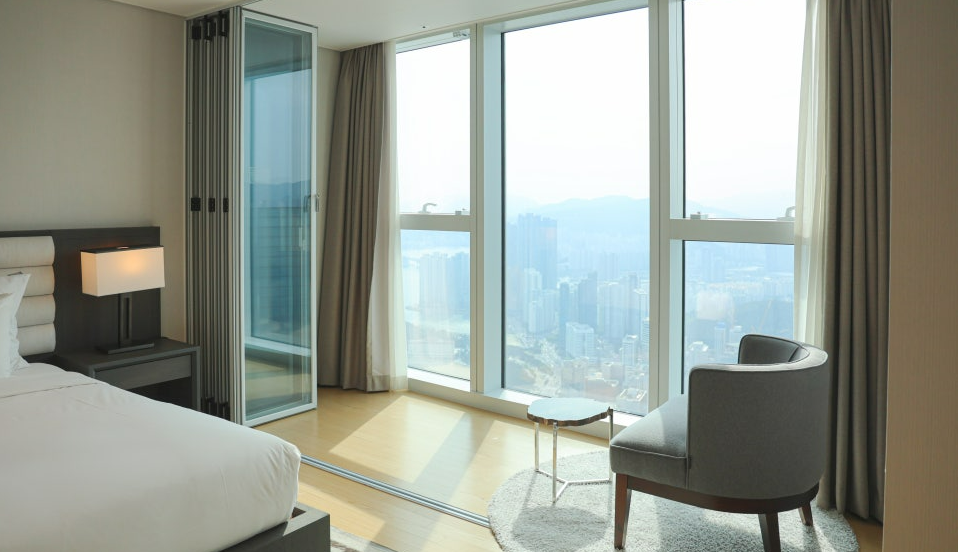 방에 들어서자마자 보이는 통유리창 너머 해운대 바다와 광안대교…